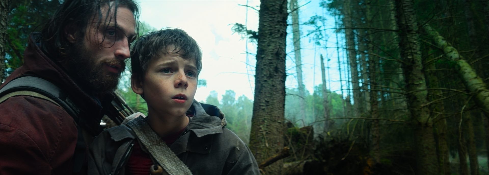 Und das liegt nicht daran, dass neben den iPhone-15-Geräten auch noch die DJI Inspire 3 sowie die GoPro Hero 4K und eine Panasonic AU-EVA1 zum Einsatz kamen. Letztere wurde für die Infrarotsequenzen benutzt, während die DJI Inspire für Drohnenaufnahmen und die GoPro Hero vermutlich für ein paar der POV-Actionmomente hergenommen wurde. Hauptgerät(e) allerdings blieb(en) das/die iPhone(s). Im Gegensatz noch einmal zu June & John schraubten Boyle und sein Kameramann Anthony Dot Mantle den Smartphones allerdings ziemlich hochwertige (anamorphotische) Optiken vor die eigentliche Linse. Das lässt den Film insgesamt zwar etwas kinohafter erscheinen, führt allerdings auch zu teils massiven Rand-Rundum-Unschärfen mit einem nur geringen Fokusbereich in der Mitte des Bildes. Für die 4K-Disk masterte man das Ganze ausgehend von einem 4K-DI und fügte HDR10 und Dolby Vision sowie einen im Rahmen von Rec.2020 erweiterten Farbraum hinzu. Das Ergebnis ist … besser als bei June & John. Aber einerseits nur knapp. Und andererseits weist es teils krasse Probleme und Artefakte auf. Durchweg sichtbar sind schon einmal chromatische Aberrationen – oft zu erkennen an Spikes Köcher oder den Umrandungen seines Parkas. Zooms leiden augenblicklich unter unschönem Grieseln, das sich vordergründig auch seltsam verschiebt (80’48) und die Texturen sind durchweg verwaschen und wachsig. Die iPhones können 4K und sind angeblich tolle Geräte. Sollte das so sein, sieht man hier nichts davon. Geht es um Auflösung in der Tiefe, sieht man nicht mehr als verwaschene Laubblätter. Kommt Bewegung ins Spiel, verschwimmt das Ganze oftmals, während es zusätzlich gelegentlich böse Artefakte wie das mittige Muster bei 13’56. Ähnliche Artefakte gibt es immer wieder und sind exemplarisch bei 27’55 oder weiteren Szenen im Wald zu sehen. Eine Art kreisrunder Artefaktring im Hintergrund lässt das Bild wirken, als hätte es einen Fingerabdruck. Rund um die Flagge bei 53’59 gibt’s außerdem Randartefakte und es gibt nur wenige Einstellungen, in denen mal keine Probleme zu erkennen sind. Überstrahlungen sind ebenfalls ein Thema. Oft wirkt das HDR eher überdramatisch und Farben sind mitunter derart bunt, dass man meint, die Pop-Effekt-Einstellung der Fotobearbeitung im Smartphone wurde auf Vollanschlag gestellt. Gesichter sind indes zu keinem Zeitpunkt gut durchzeichnet oder ansprechend aufgelöst. Fast durchgehend wirken sie glatt bis wachsig. Insbesondere Halbtotale leiden unter wachsweichen und verwaschenen Oberflächen. Das alles, wohlgemerkt bezogen auf die technische Ausgangsqualität. Der Disk kann man hier, ähnlich zu June & John, eher keinen Vorwurf machen. Das Bild ist von der Basis her aber so schwach, dass man praktisch auch nicht erkennen kann, ob von der 4K-Disk noch eigene Probleme erzeugt werden.