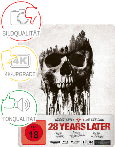 28 Years Later bekam für die Blu-ray DTS-HD-Master-Tonspuren für beide Sprachen (Deutsch und Englisch). Die verlustfrei kodierten Ausgaben überzeugen beide durchaus, mit leichten Vorteilen beim O-Ton. Zunächst ist die deutsche Tonspur rund 3-4 dB leiser eingepegelt und in Summe beim Score und den Geräuscheffekten auch etwas weniger dynamisch. Allerdings muss man das vor dem Hintergrund betrachten, dass der O-Ton hier die Latte aus Dynamik und Wucht schon ziemlich hoch legt. Insbesondere die Dialoge fallen aber etwas präsenter und punchiger aus, während die deutsche Synchro eine Spur mehr zurückgenommen wirkt. Nichtsdestotrotz bekommt man nach 29 Minuten eine fulminante Gänsehaut, wenn die Infizierten den Hügel runterrennen und wie Schweine in heller Aufruhr von den Rearspeakern kreischen. Die akustische Dynamik während der Attacken ist wirklich gut und lässt auch nicht nach, wenn die Soldaten nach 64 und 65 Minuten angefallen werden. Das sägende Filmscore-Geräusch bei 65’30, das einem derart laut und intensiv von den Rears in den Nacken geblasen wird, lässt den Zuschauer beeindruckt im Sessel zusammensinken. Dazu gibt es auch feinste Signale, wie das Säuseln der Insekten über den grünen Wiesen und spürbare Bassattacken im Wechsel – bspw. bei der rennenden Reh-Herde nach 20’40, die mit spürbarem Nachdruck über das weite Feld flüchtet.