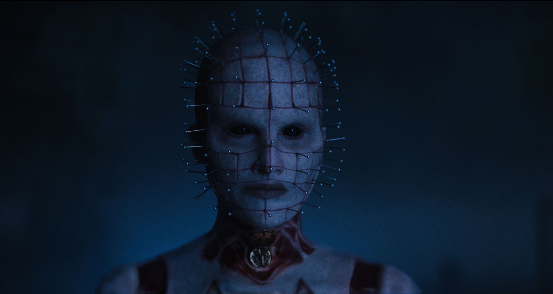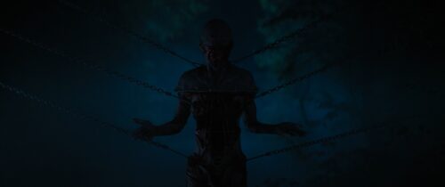 Als es in die Produktion des Reboots ging, hat sich Clive Barker dann explizit hinter die Besetzung der Rolle mit einer Transgender-Darstellerin gestellt und als Produzent des Reboots Bruckner und sein Team dafür gelobt, die (Hellraiser) Mythologie geehrt zu haben. Wenn man also die Diskussion an der Hauptfigur und ihrer Darstellung innerhalb der Filmreihe festmacht, dann darf man sich mit dem Argument auseinandersetzen, dass eine Transgender-Darstellerin weitaus eher zur Romanfigur passt und sogar wortwörtlich und inhaltlich genauer ist. Wenn das Wort “Transgender” das Präfix “trans” (also hinüber, jenseits, über etwas hinaus) beinhaltet; man sich dann die Zenobiten anschaut, die sich durch ihre Transformation definieren (Menschen, die durch Schmerz und Lust ihre menschliche Hülle überwunden haben, um etwas “Größeres” zu werden), dann war Hellraiser eigentlich immer schon ein Manifest für das Überwinden einer binären Definition von Sex. Diese metatextuelle Ebene passt im Grunde sogar vorzüglich zur Rolle des Leading Cenobite. Zumal die Ambiguität, die Jamie Clayton in die Figur einbringt, indem sie einerseits eine feminine Eleganz ausstrahlt, gleichzeitig aber diese Härte umsetzt, genau dieses “uncanny valley” der Cenobites unterstreicht, weil es sich eben nicht in klassische Geschlechterrollen pressen lässt. Lange Rede, kurzer Sinn (und man mag mich dafür jetzt kritisieren): Für mich passt Clayton vorzüglich als neuer “Pinhead” und sie macht das auch darstellerisch klasse. Wenn überhaupt, dann krankt Hellraiser – Schloss zur Hölle an einem Faktor: Laufzeit. Zwei Stunden Film mögen für einen Genrefilm okay sein, wenn komplexe gesellschaftspolitische Themen verhandelt werden und eine Vielzahl an ebenso komplexen Figuren interagieren muss. Jetzt ist das Grundkonstrukt von Hellraiser aber nicht extrem komplex. Und so hält sich der Film teils zu lange mit unbedeutenden Dingen auf, während er mit den Themen Selbstzerstörung und Sucht durchaus aktuelle(re) Motive integriert, die aber wiederum etwas zu kurz kommen. So wird kurz mal thematisiert, dass man in Rileys Gegenwart keinen Alkohol trinkt, was aber weder weiterverfolgt wird oder gar Auswirkungen auf die Protagonistin hat. Während man in puncto Charakterentwicklung entsprechend öfter mal auf der Stelle tritt, hat Regisseur Bruckner trotz allem verstanden, in welchem Franchise er sich hier befindet, und distanziert die vorherigen Teile teilweise um Galaxien. Insbesondere die Atmosphäre in Voights Anwesen, das Set- und Kostümdesign sowie die Kreaturen und die praktischen Effekte überzeugen. Sobald die Zenobiten auftauchen, lebt Hellraiser – Schloss zur Hölle spürbar auf. Alleine das gruselige Klackern des Chatterers sorgt für eine anständige Gänsehaut. Und Clayton als Leading-Cenobite überzeugt absolut. Leider kann man das von der teils hyperhysterisch charakterisierten Riley-Figur nicht durchweg sagen.