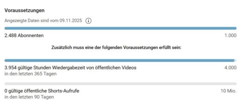 Was die YT-Monetarisierung angeht, waren mir die 1000 Abonnenten als Minimum klar. Aber die 4000 Stunden Watchtime nicht. Und das ist schon eine Menge Holz.