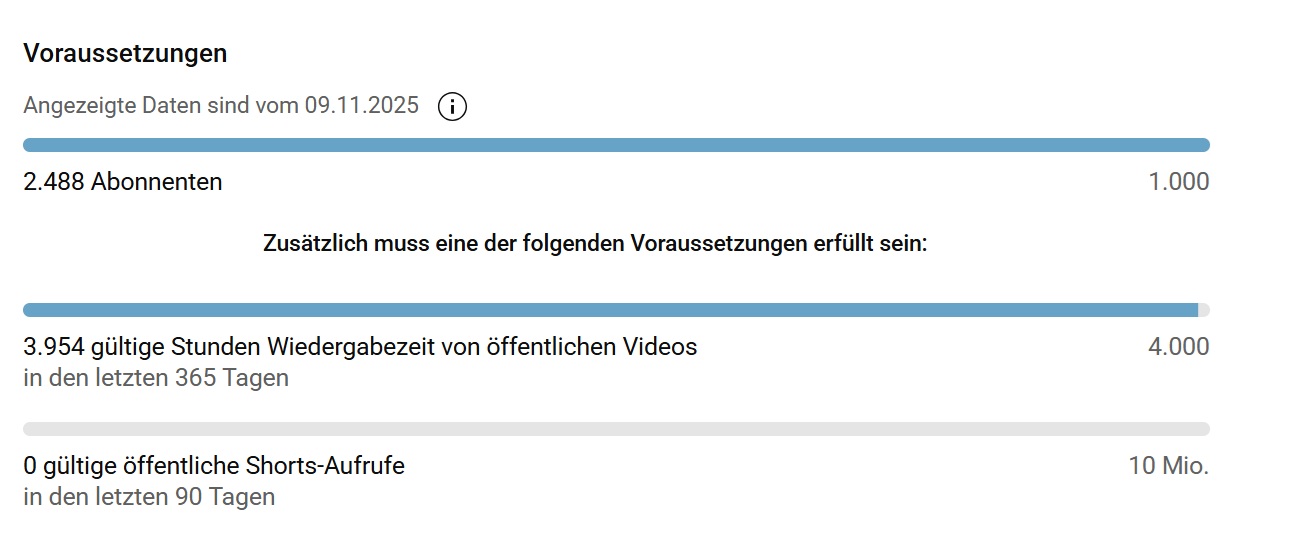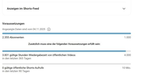 Krass ist, dass du auch über Shorts in die Monetarisierung kommen kannst – aber da brauchst du in Summe 10 Mio. Views in 90 Tagen 10 MILLIONEN IN 90 TAGEN!