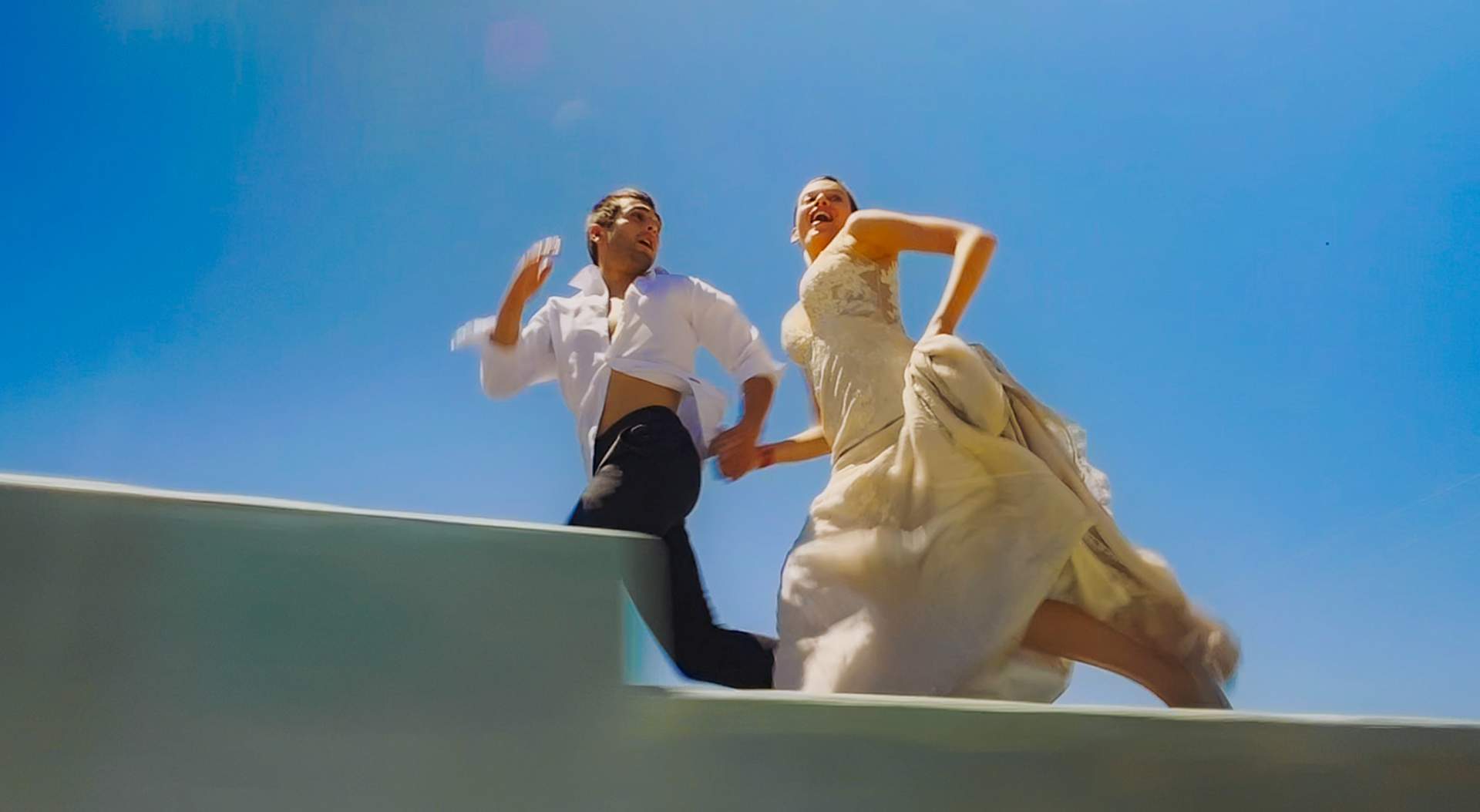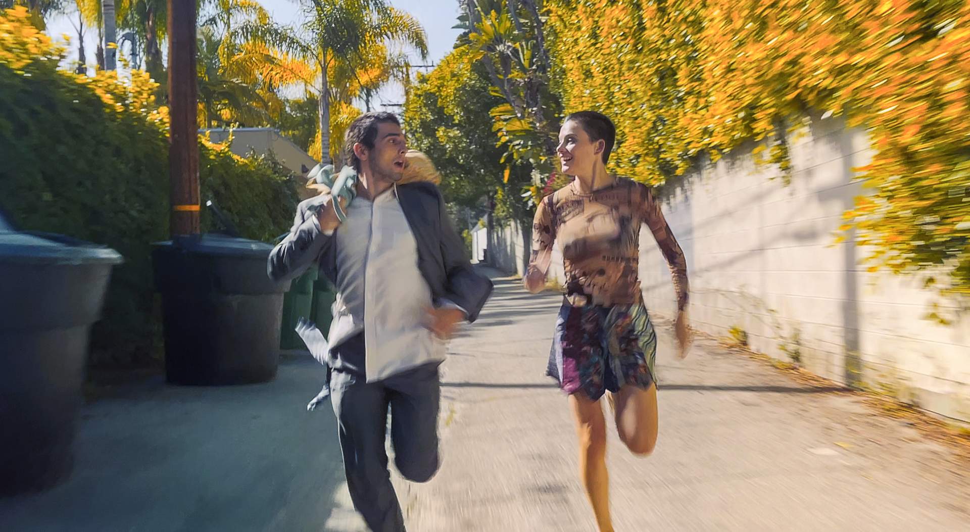 Dass June & John bereits während der Pandemie im Jahr 2020 gedreht wurde, erklärt vielleicht, warum sich der Film so losgelöst von Zwängen anfühlt. Besson nutzte die Zeit und den Freiraum für einen Guerilla-Dreh im eigentlichen Sinne: mit minimaler Crew, ohne offizielle Drehgenehmigungen, dafür mit viel Spontaneität und einem Hauch Anarchie. Das Ergebnis ist ein Film, der so wirkt, als wäre er manchmal schneller gedreht als gedacht – was aber überraschend gut zu seinem wilden Herzschlag passt. Die Kamera (gedreht wurde mit iPhones) ist nah dran an ihren Figuren, oft hektisch, manchmal roh, aber nie unkontrolliert. Man spürt, dass Besson keinen Studio-Boss im Nacken hatte, sondern wieder einfach drauflos filmen konnte. So wie damals, als seine Figuren noch echte Exzentriker waren und nicht nur kalkulierte Bausteine im Blockbuster-Baukasten. Statt minutiös geplanter Studiobauten gibt’s echtes Straßengefühl. Los Angeles im Ausnahmezustand, die Stadt der Engel als Bühne für einen Wahnsinnstrip (bei dem hin und wieder Menschen mit Masken im Hintergrund zu erkennen sind). Und Wahnsinn trifft es ziemlich gut. June & John ist temporeich bis atemlos, ein Film, der kaum zur Ruhe kommt. Wer einmal eingestiegen ist in diese rasante Odyssee zweier Außenseiter, findet kaum Gelegenheit zum Luft holen.  Kaum hat man sich mal an eine halbwegs lineare Szene gewöhnt, bricht auch schon das nächste Chaos über einen herein: Überfälle, Verfolgungsjagden, Fallschirmsprünge, Rückblenden, Fantasie-Sequenzen – alles im Wechselbad der Gefühle zwischen Bonnie & Clyde, Natural Born Killers, Thelma & Louise und einer Prise Crank: Eine absurde „Entführung“ im Büro, eine spontane Flucht, ein herunterfallendes Klavier, eine Hochzeit unter funkelnden Lichterketten mitten in der Wildnis – kitschig, ja, aber auf diese eigenwillige Besson-Art eben auch charmant. Zwischen all der Hektik findet der Film außerdem immer wieder kleine, stille Momente, in denen seine beiden Hauptfiguren einfach mal sein dürfen. Und vielleicht sind es gerade diese Augenblicke, die June & John davor bewahren, zur reinen Karikatur zu werden.