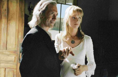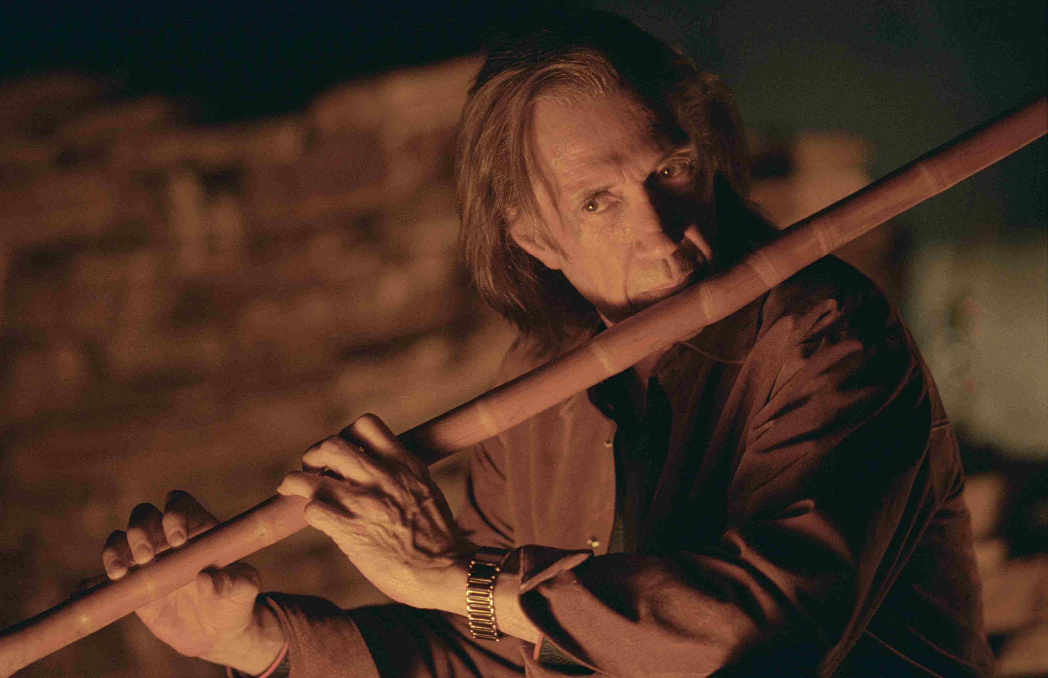 Überhaupt die Musik. Hatte RZA im ersten Teil noch treibende Beats beigesteuert, verlässt sich Tarantino hier fast vollständig auf die atmosphärischen Klänge von Morricone, Luis Bacalov und Johnny Cash. Die Musik unterstreicht die Schwere und die Melancholie, die über dem Geschehen liegt. Selbst die Trainingssequenz beim legendären Pai Mei, herrlich streng und mit inbrünstigem Antiamerikanismus und Frauenfeindlichkeit, gespielt von Gordon Liu (der im ersten Teil noch den Chef der Crazy 88 verkörperte), wirkt wie ein klassischer Kung-Fu-Lehrfilm der 70er Jahre und fügt sich organisch in den Western-Look ein. Doch das Herzstück dieses Films ist David Carradine. Sein Bill war im ersten Teil nur eine Stimme, eine unsichtbare Bedrohung. Hier manifestiert er sich als sanftmütiger Sadist mit einer hypnotischen Präsenz. Dass die Rolle ursprünglich für Warren Beatty vorgesehen war, scheint im Nachhinein unvorstellbar. Carradine verleiht dem Charakter eine väterliche Wärme, die den Verrat umso schmerzhafter macht. Das finale Aufeinandertreffen ist kein wildes Gemetzel, sondern ein langes Gespräch an Bar und Terrassentisch. Tarantino dreht das Tempo radikal runter und läuft zu textlicher Hochform auf. Bills Monolog über Superman und die Alter Egos der Superhelden ist nicht nur popkulturelle Philosophie, sondern der Schlüssel zum Verständnis der Beziehung zwischen ihm und Beatrix. Er sieht in ihr den geborenen Killer, der sich nicht hinter einer bürgerlichen Fassade verstecken kann. Carradine liefert hier wahrscheinlich seine beste späte Rolle: tieftraurig, selbstverliebt, philosophisch, manipulierend, und doch immer menschlich.