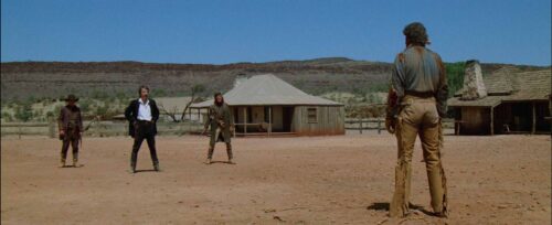 Gegenüber der Blu-ray bietet die UHD Blu-ray von Quigley der Australier nun eine neu abgemischte DTS-HD-Master-Tonspur in 5.1, während der 2.0-PCM-Ton im Grunde identisch ist, aber an einigen Stellen etwas besser im Sync erscheint. die neue 5.1-Fassung klingt schon während der Filmmusik zu Beginn wunderbar. Die Surroundatmosphäre ist von Anfang an toll, wenn bspw. die Möwen links und rechts kreischen. Die Schüsse nach 21:30 sind phänomenal räumlich und klingen dazu auch wirklich gut. Immer wieder verhallen sie unglaublich authentisch durch das Outback und sorgen für eine tolle Atmosphäre. Das ist um Welten besser, räumlicher und immersiver als über die dagegen ziemlich fad klingende alte 5.1-Fassung der Blu-ray. Auch Dynamik darf man hier auch attestieren – beispielsweise beim Schuss nach 57’45. Was Capelight hier wieder abgeliefert hat, ist ganz wunderbar. Selbst wenn Stimmen gelegentlich immer noch etwas dünn klingen. Während auch der englische 5.1-Ton klingt, als hätte man hier noch mal Hand angelegt, ist dessen 2.0-PCM-Pendant identisch zu jenem der Blu-ray.