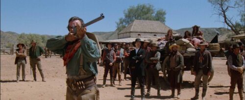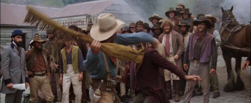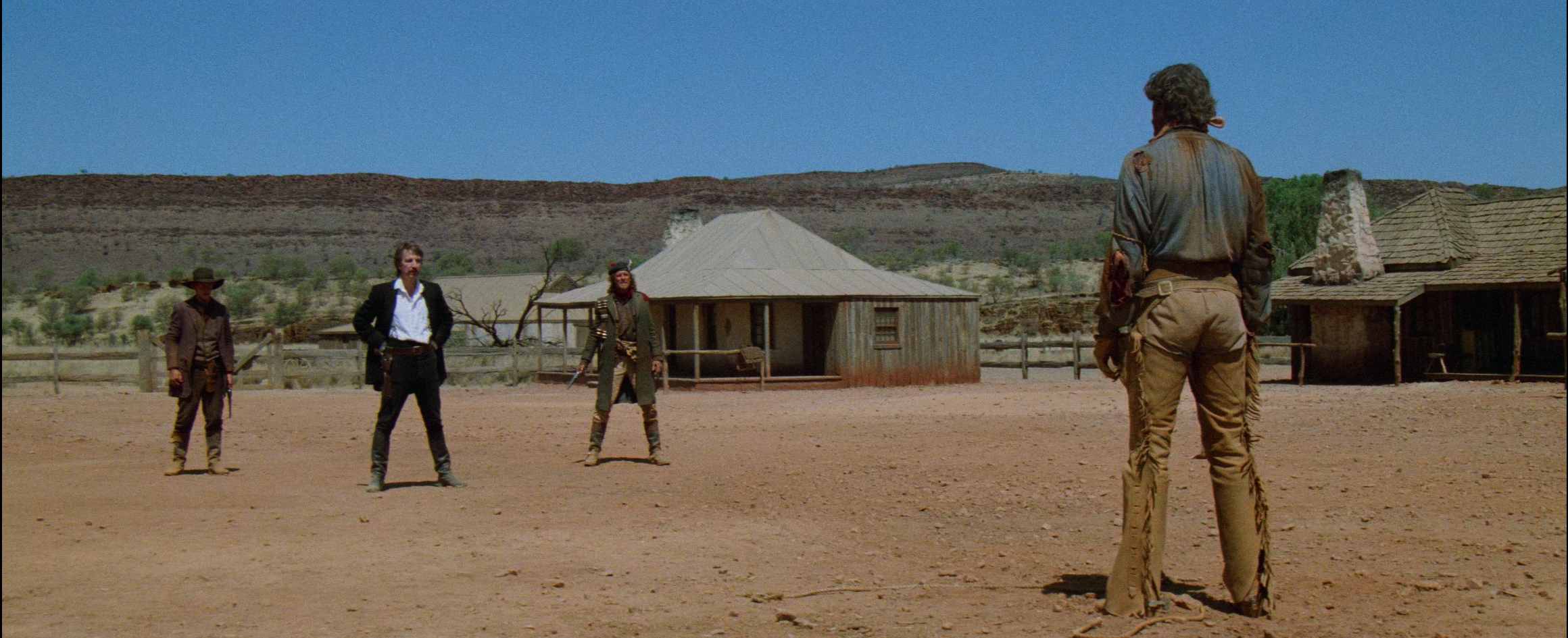 Kameramann David Eggbys nahm den Film mit Panavision-Kameras auf 35-mm-Analogfilm auf. Die verwendeten Optiken waren anamorphotisch und das Bildseitenverhältnis lag bei 2,35:1. Ausgehend von dem Material wurde für die 2024er 4K-Disk von Shout Factory ein frischer 4K-Scan durchgeführt, der auch als Basis für Capelights-4K-Veröffentlichung diente. Obendrauf gab’s für die Scheibe HDR10 und Dolby Vision sowie einen im Rahmen von Rec.2020 erweiterten Farbraum. Herausgekommen ist eine ganz wunderbare UHD Blu-ray. Die 4K-Disk präsentiert Quigley deutlich organischer, mit wunderbar feiner Auflösung der Körnung im Himmel oder auf den staubigen Pfaden entlang des Wegs. Prächtig rot ist bereits Quigleys Halstuch, was aber noch von den Rotröcken übertroffen wird, die nach elf Minuten anreiten. Deren Uniformjacken knallen förmlich vor dem ansonsten braundominierten Hintergrund hervor. Kein Vergleich mehr zur eher entsättigten BD. Der Himmel ist überdies kräftig blau und leuchtet bisweilen regelrecht. Die gut gebräunten Gesichter werden kräftig wiedergegeben und helle Elemente leuchten im Angesicht von HDR10 und Dolby Vision förmlich. Klasse auch die Detailtiefe beim Anblick der Hausdächer nach 16 Minuten, auf denen man fast jede Schindel einzeln erkennen kann. Sichtbar auch: das Fehlen von Nachschärfungsartefakten und Schmutzpartikeln sowie die nun korrekte, in der Vertikalen gegenüber der BD gestauchte, Bildgeometrie. Gelegentlich geht’s mit dem Kontrast in dunkleren Szenen mal ein wenig in die Knie und die Durchzeichnung geht etwas verloren (25’02). Außerdem sind einige Einstellungen schon ausgangsseitig nicht sehr scharf. Kein Problem der Disk, sondern eher eins der verwendeten Optik oder dem nicht perfekt sitzenden Fokus (7’35). Das gilt auch für die Randunschärfen, die stellenweise auftauchen und aufgrund der anamorphotischen Objektive entstanden sind.